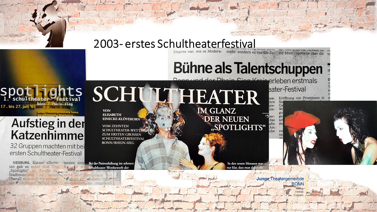 Bevor spotlights 2002 erstmalig an den Start ging, hatte die Junge Theatergemeinde BONN schon viele Jahre einen Schultheaterwettbewerb ausgeschrieben. Auch hier konnten sich Schulen aus Bonn und dem Rhein-Sieg-Kreis mit ihren Produktionen bewerben. Und wie bei spotlights besuchte die Jury die Aufführungen vor Ort und vergab zum Ende des Schuljahres verschiedene Preise. mehr…